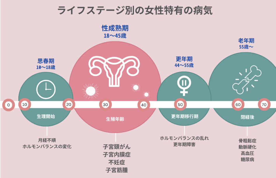 女性のライフステージ(年齢)の変化に応じて、発症しやすい病気も変化していきます。