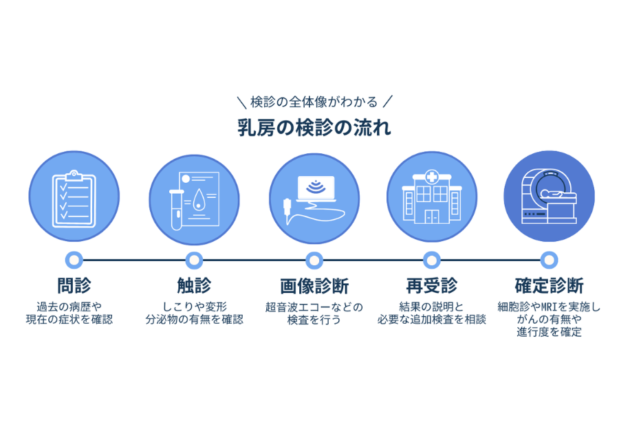 乳房の触診を行い、しこりや変形、血乳などの分泌物がないか確認します。