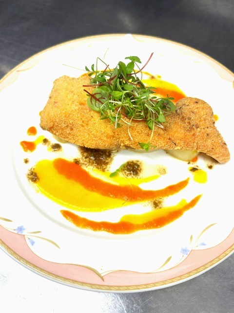 本日のランチは、刺身用のノルウェーサーモンにデュラムセモリナ粉をつけて、